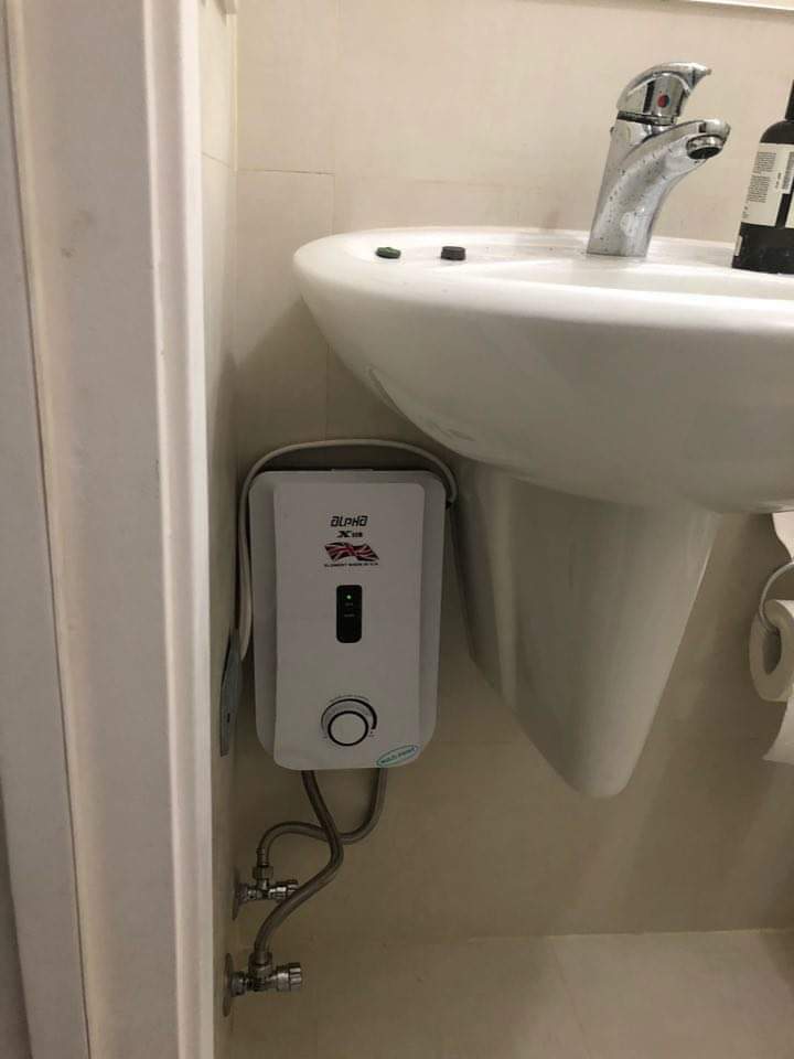 With split type AC, multipoint heater, ref, induction stove, water heater, dining set for two and sofa.