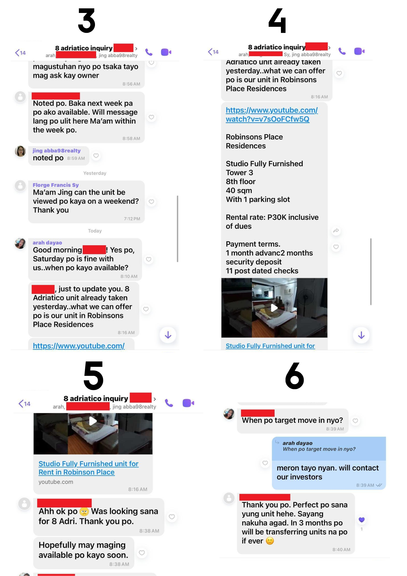 Our listing in 8 Adriatico has been rented out already! We are now looking for new units to offer our latest prospect. Check out our conversation with Arah, Jing and one of our prospects below: