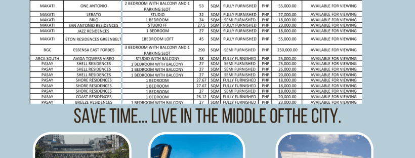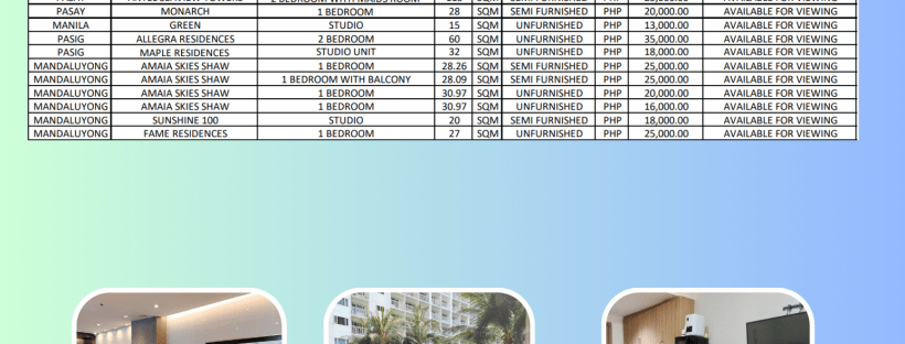 The latest updates for the condominium rentals industry in the Philippines is very much affected by the ongoing political issues involving POGO. The drama has affected other industries relating to companies that abide by the book as it tarnished the industry. It created a ripple effect, as uncertainty with foreign companies had them pulling the … Continue reading Oct. 2024: A Renter’s Market ( Available units as of Sept. 23, 2024 )
